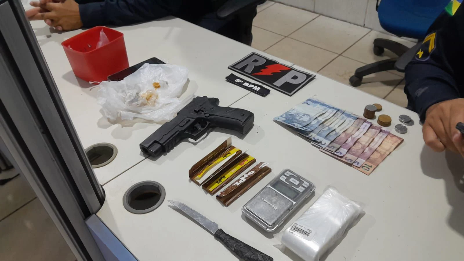 De acordo com a PM, a guarnição realizava patrulhamento de rotina quando os suspeitos correram ao avistar a viatura, o que motivou a abordagem. Durante a revista, os policiais encontraram porções de crack, uma balança de precisão, sacos plásticos utilizados para embalo de drogas, dinheiro em espécie e um simulacro de pistola.