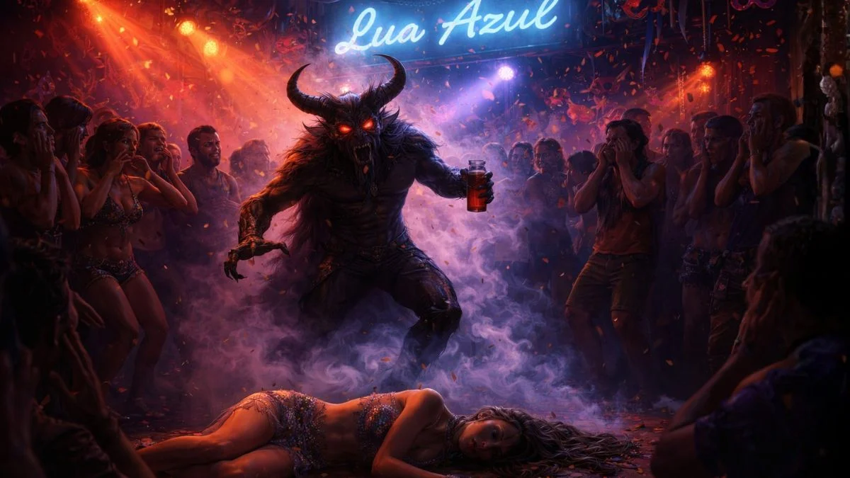 Entre risadas e excessos, ninguém imaginava que aquela seria uma noite marcada pelo medo. Por volta da meia-noite, em meio às luzes e ao som ensurdecedor, surgiu uma figura assustadora: rabo, chifres, olhos vermelhos e um sorriso estranho demais para ser apenas fantasia.