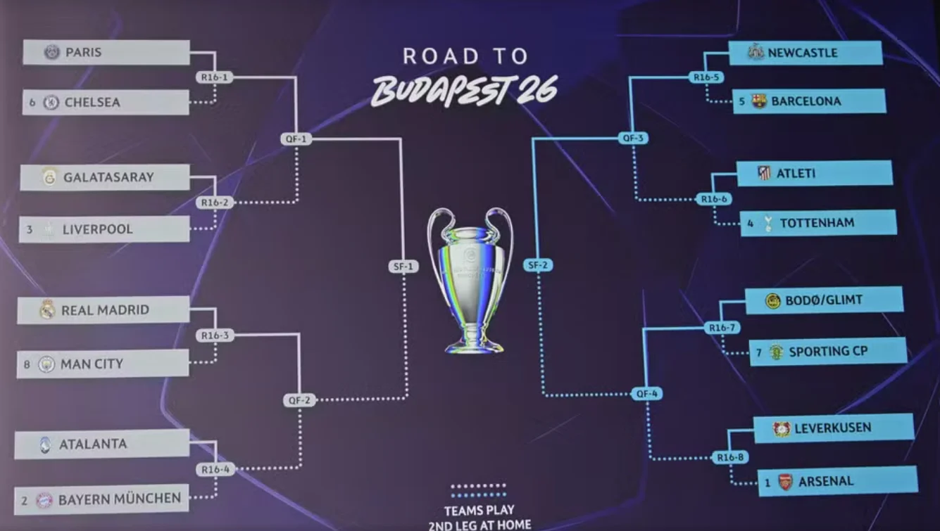 O sorteio das oitavas de final da UEFA Champions League, realizado na manhã desta sexta-feira (27), definiu os confrontos do mata-mata e também o chaveamento até a decisão da temporada, que será disputada na Puskás Aréna, em Budapeste.