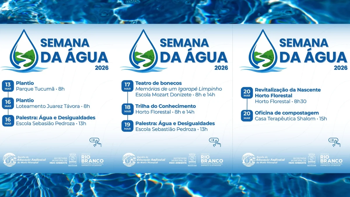A Prefeitura de Rio Branco, por meio da Secretaria Municipal de Meio Ambiente (Semeia) realizará entre os dias 16 e 20 de março uma programação especial voltada à conscientização ambiental em referência ao Dia Mundial da Água, comemorado em 22 de março.