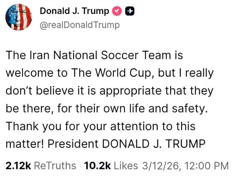 O presidente dos Estados Unidos, Donald Trump, comentou nesta quinta-feira (12) sobre a possibilidade de a seleção do Irã não disputar a Copa do Mundo FIFA de 2026. Em publicação feita na rede social Truth Social, o líder norte-americano afirmou que a equipe iraniana seria bem-vinda no torneio, mas sugeriu que a presença poderia representar riscos à segurança.