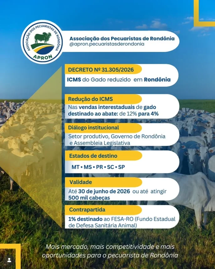 A publicação do Decreto nº 31.305/2026 pelo governo de Rondônia reduziu a carga efetiva do Imposto sobre Circulação de Mercadorias e Serviços (ICMS) nas vendas interestaduais de gado destinado ao abate. A medida diminui a alíquota de 12% para 4%, com o objetivo de ampliar as alternativas de comercialização para os pecuaristas do estado e fortalecer a cadeia produtiva da carne.