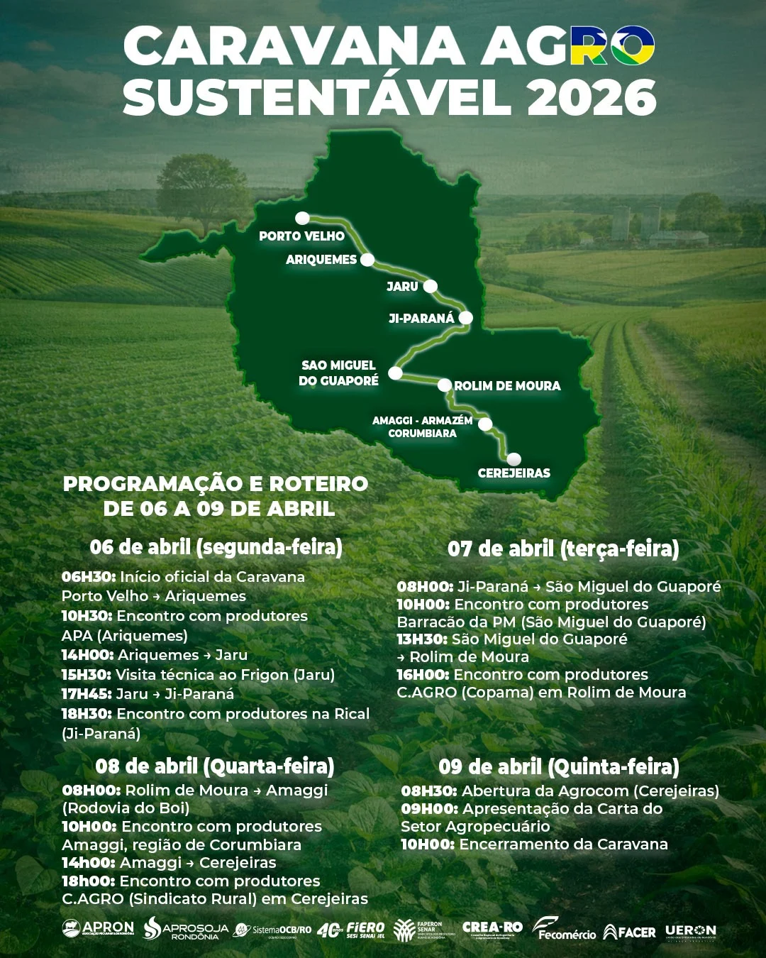 • 07/04 (Terça-feira): A caravana segue de Ji-Paraná para São Miguel do Guaporé, com reunião no Barracão da PM, e parte para Rolim de Moura, onde o encontro acontece na C.AGRO (Copama).