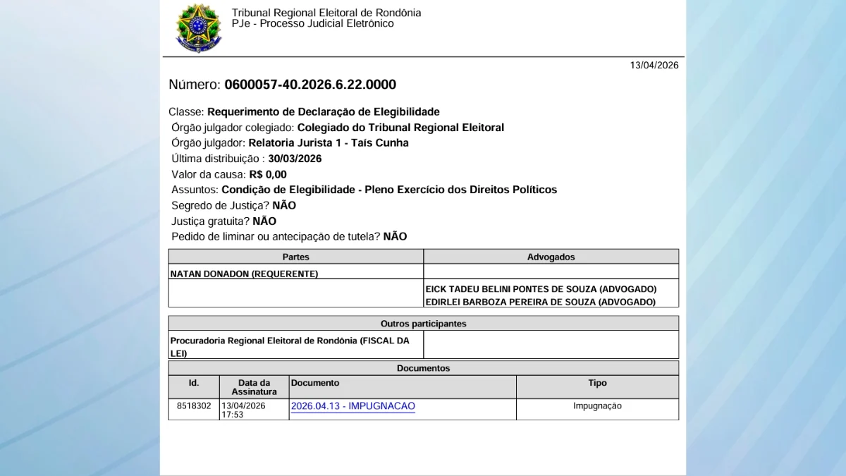 O Partido Socialista Brasileiro de Rondônia (PSB/RO) apresentou, nesta segunda-feira (13), impugnação formal ao Requerimento de Declaração de Elegibilidade (RDE) de Natan Donadon — figura que entrou para a história política brasileira como o primeiro deputado federal preso em pleno exercício do mandato, após condenação pelo Supremo Tribunal Federal. O processo corre no Tribunal Regional Eleitoral de Rondônia sob o número 0600057-40.2026.6.22.0000.